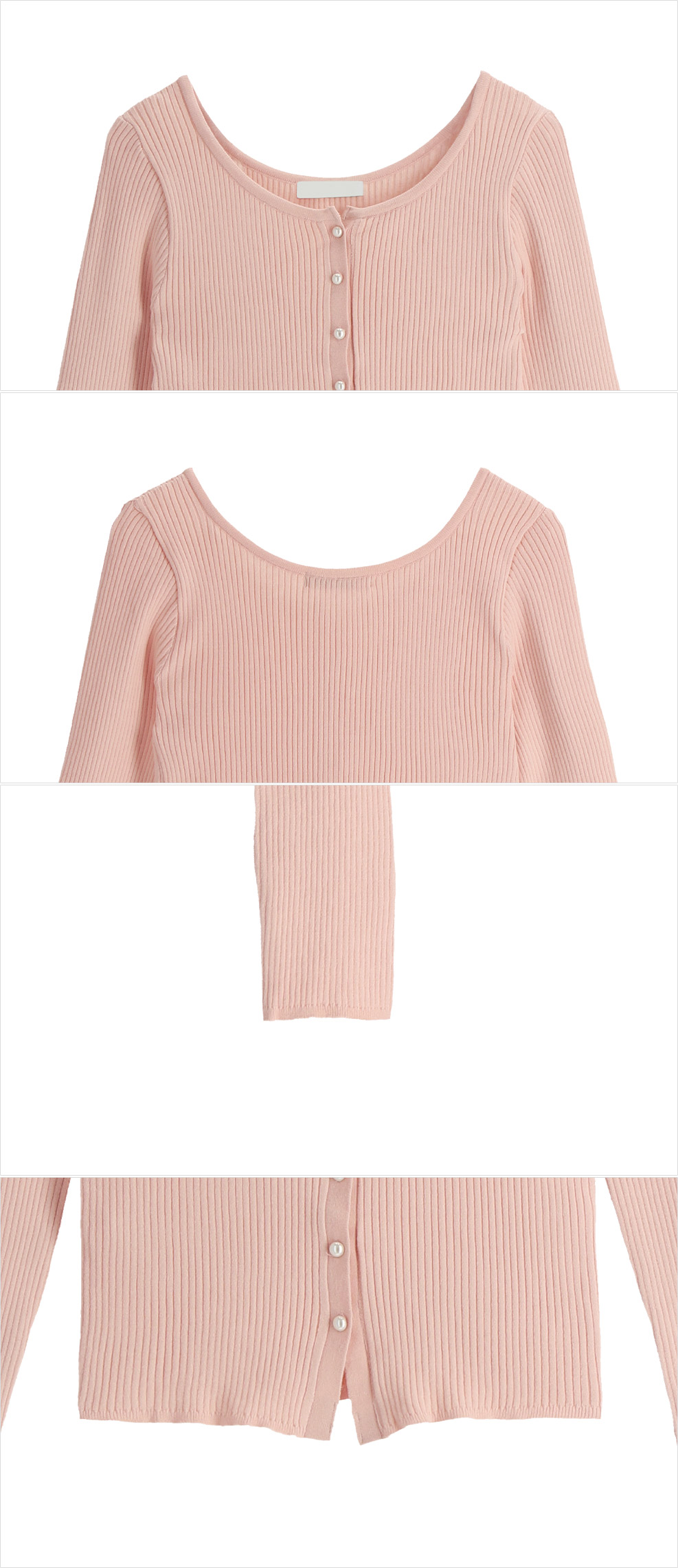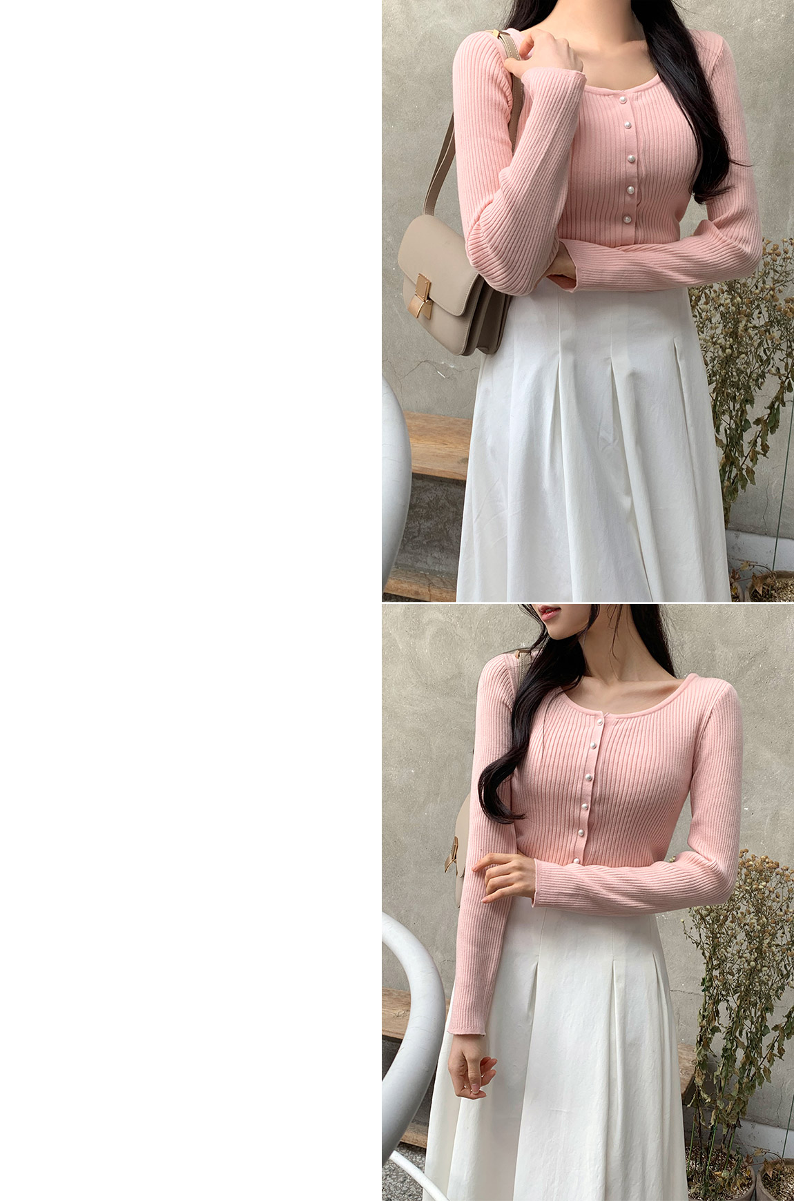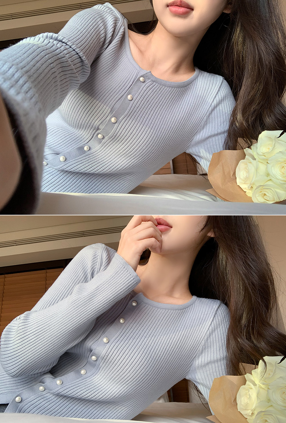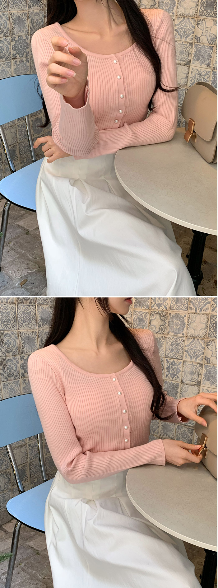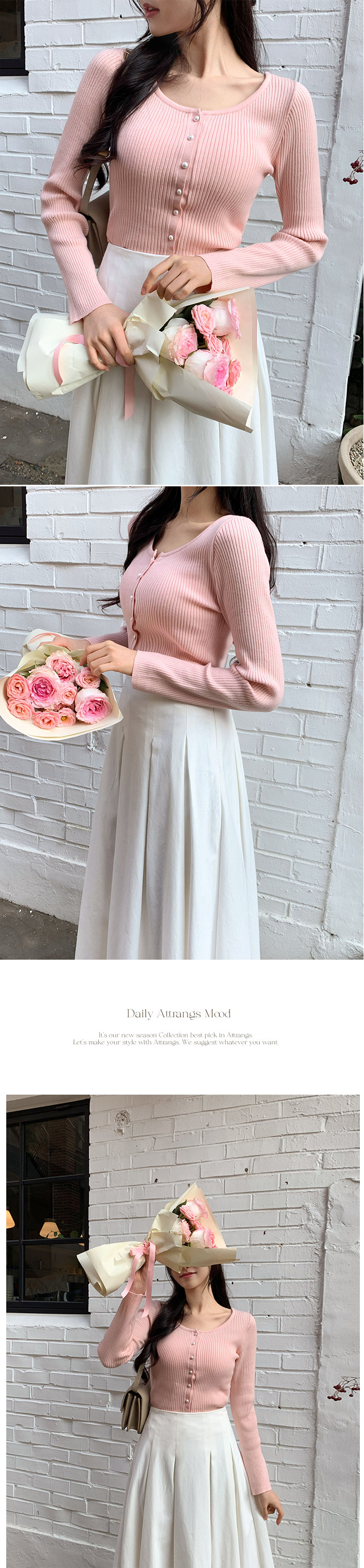 attrangs-아뜨랑스 - (페미닌/청순여리) 포엘즈 진주 버튼 유넥 슬림핏 골지 가디건♡韓國女裝上衣