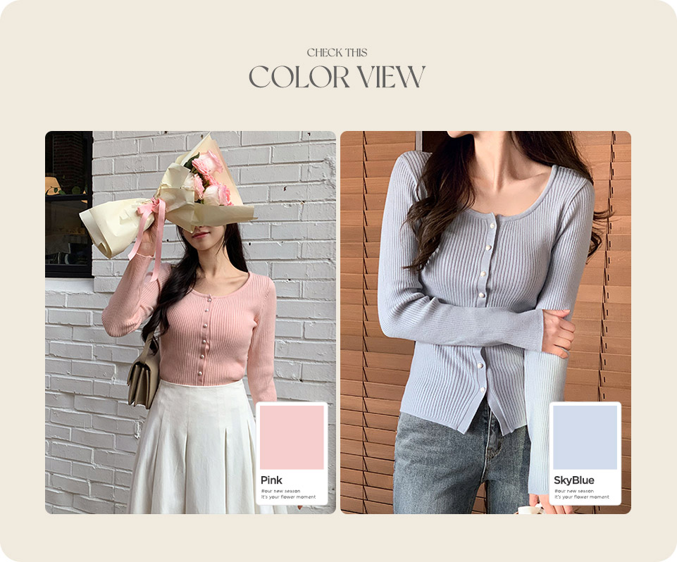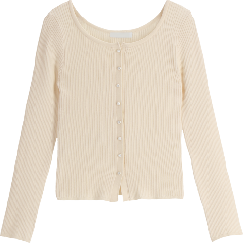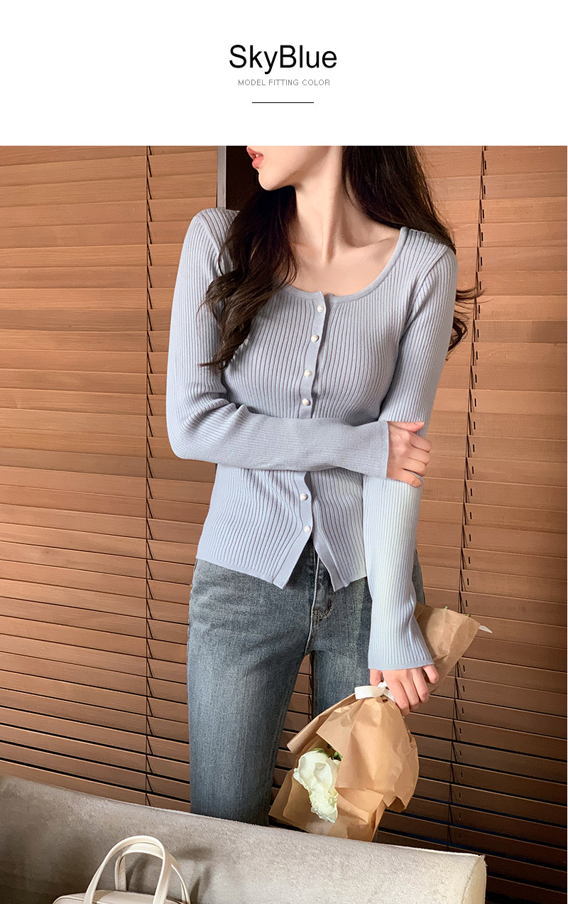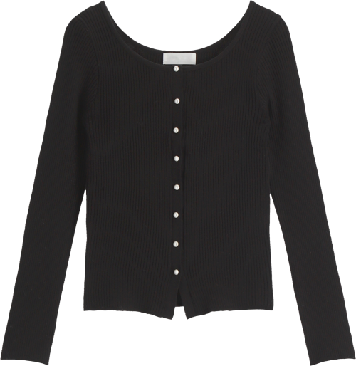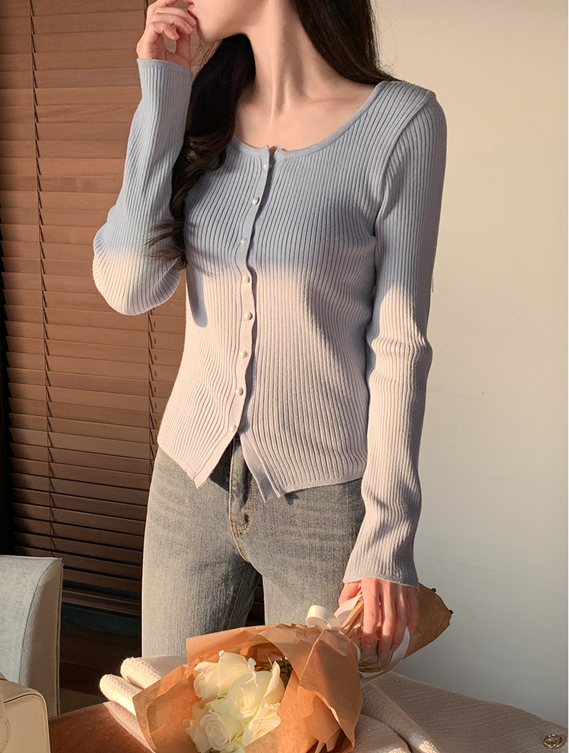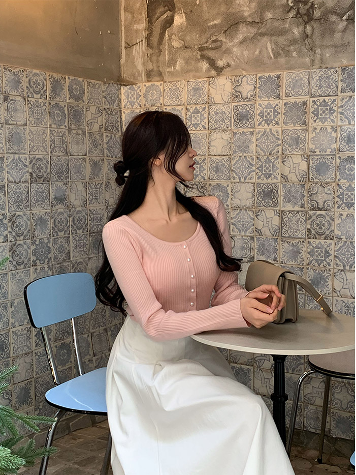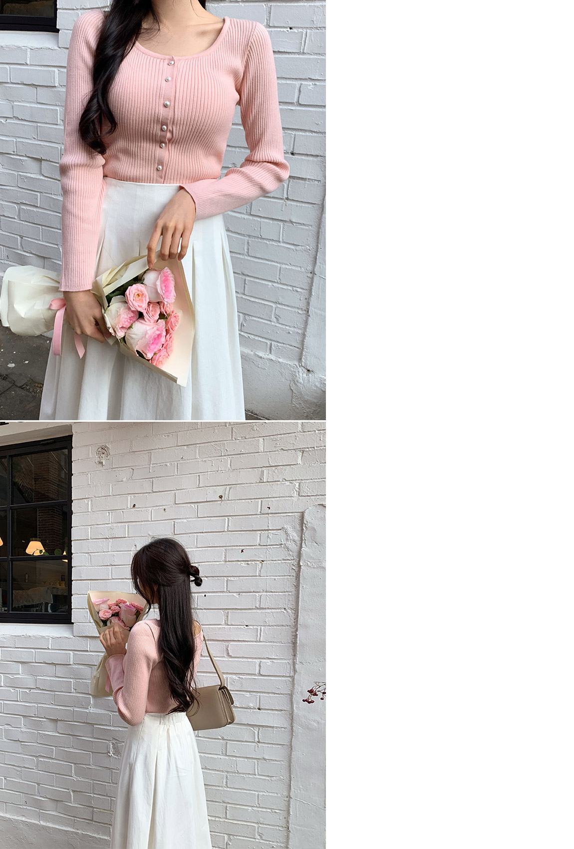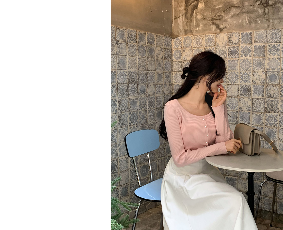 attrangs-아뜨랑스 - (페미닌/청순여리) 포엘즈 진주 버튼 유넥 슬림핏 골지 가디건♡韓國女裝上衣
