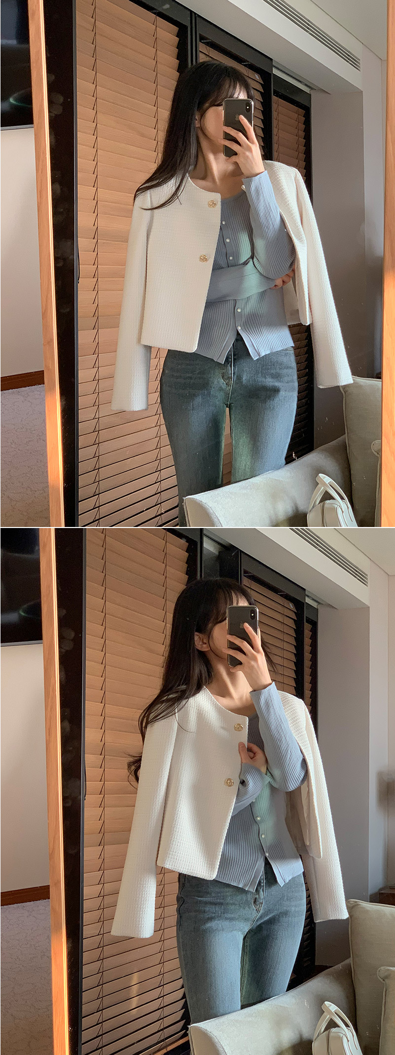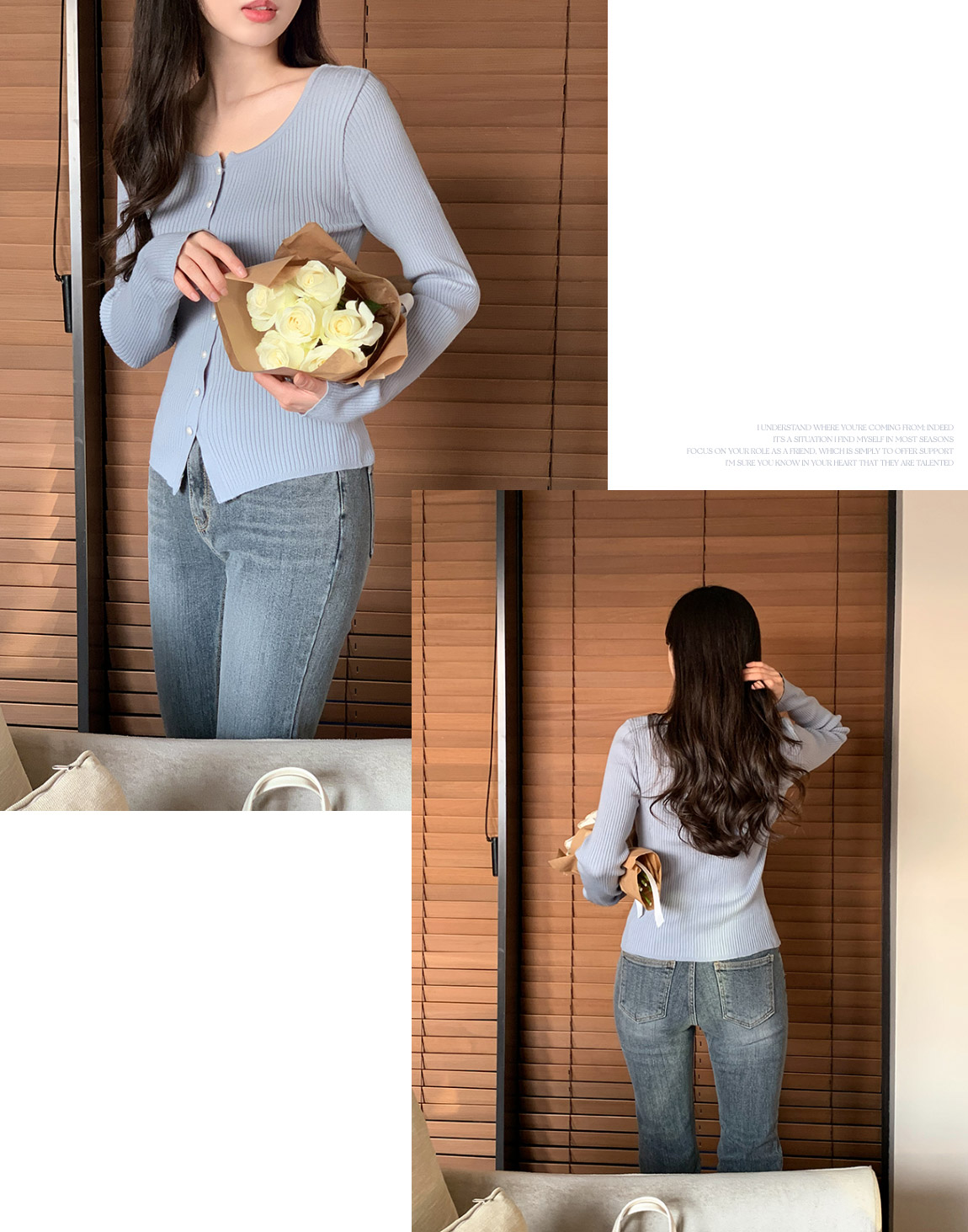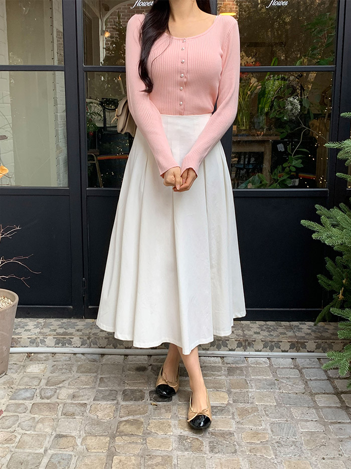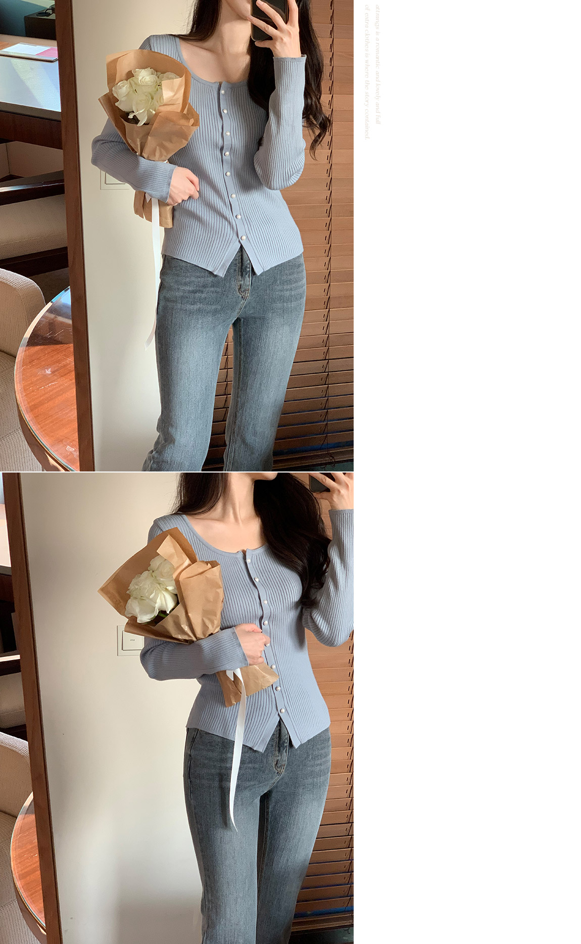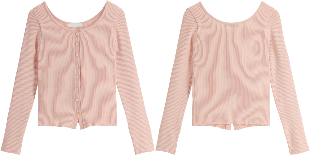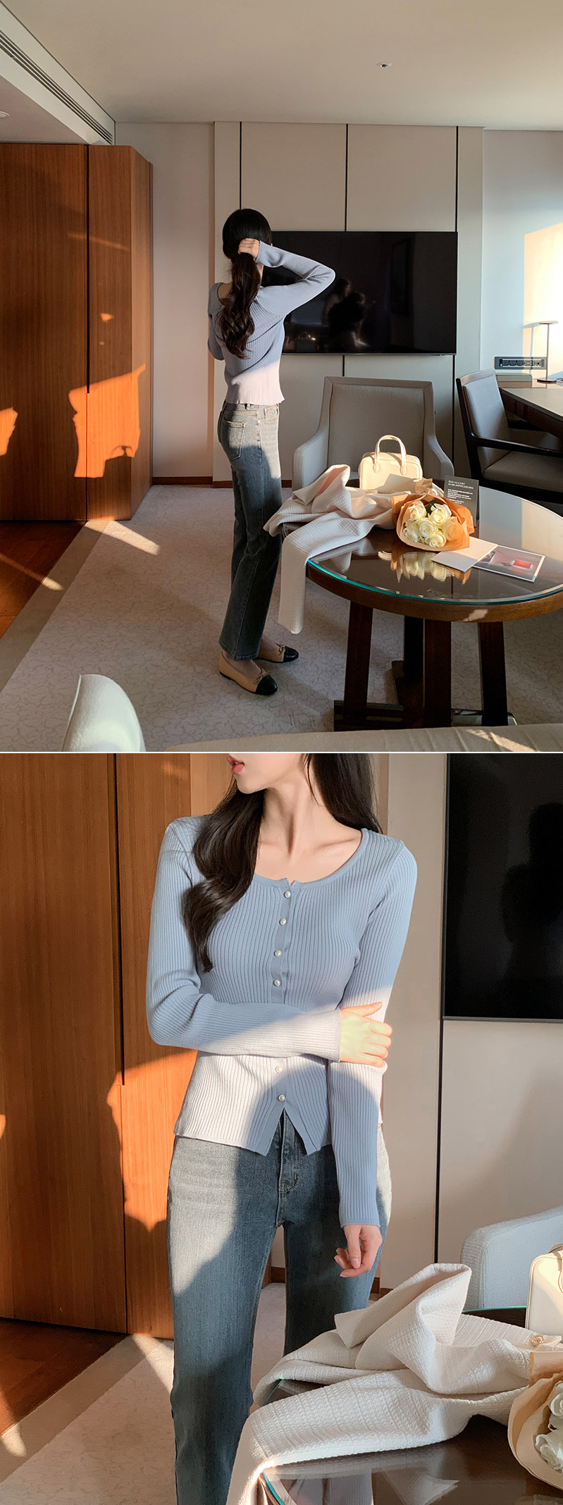 attrangs-아뜨랑스 - (페미닌/청순여리) 포엘즈 진주 버튼 유넥 슬림핏 골지 가디건♡韓國女裝上衣