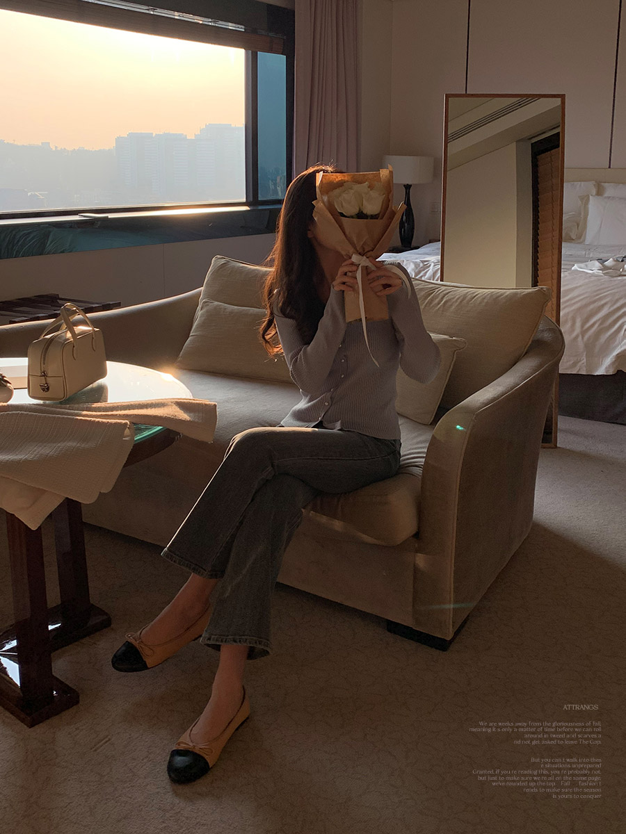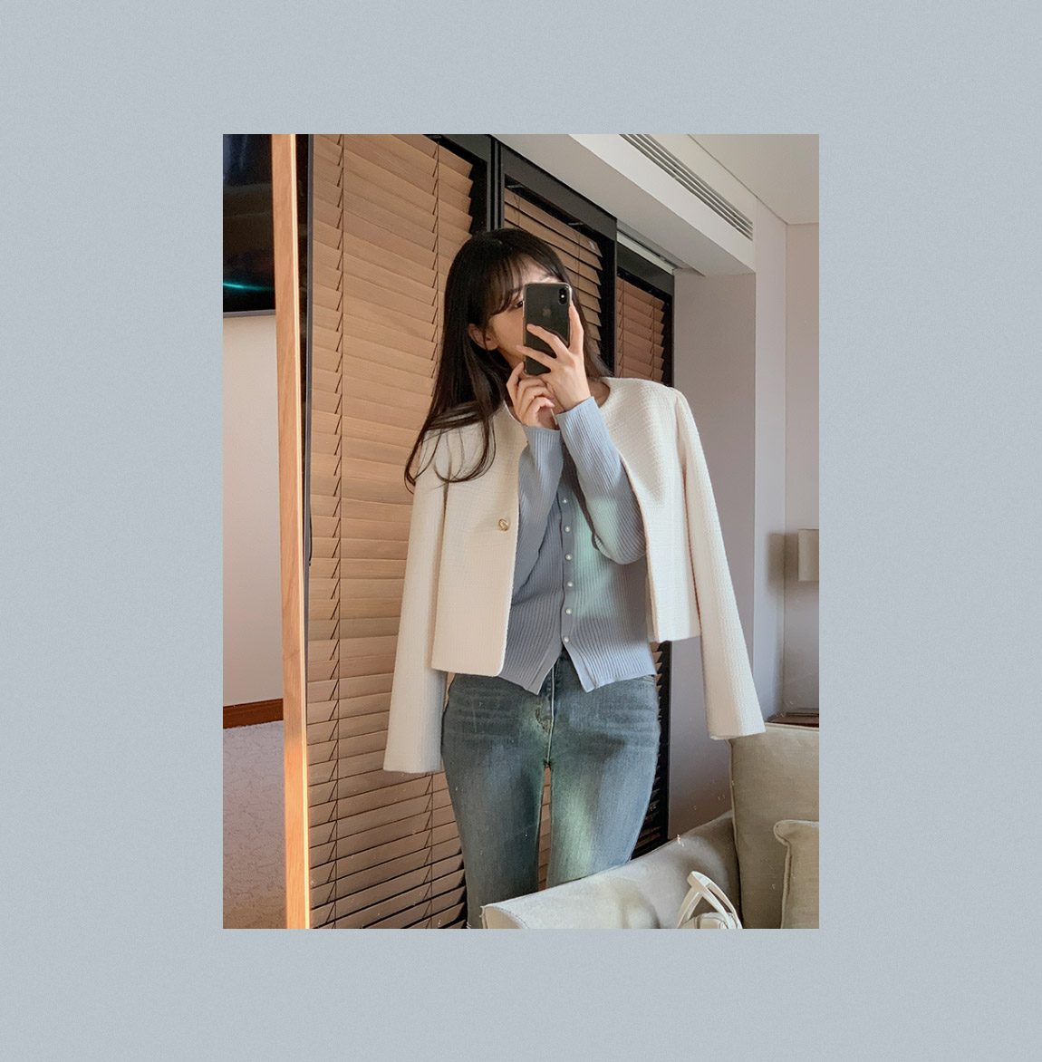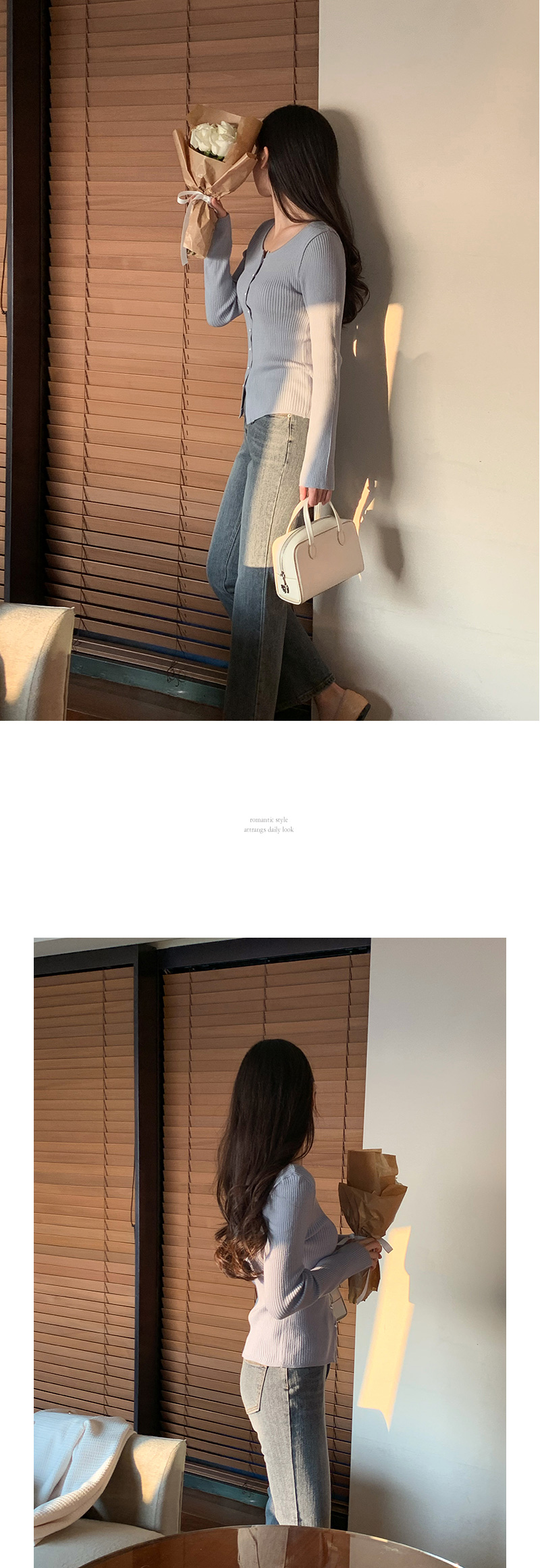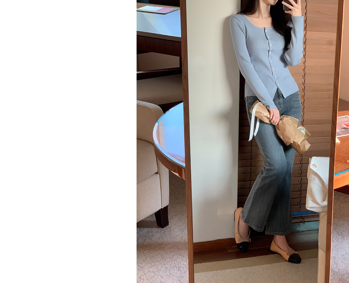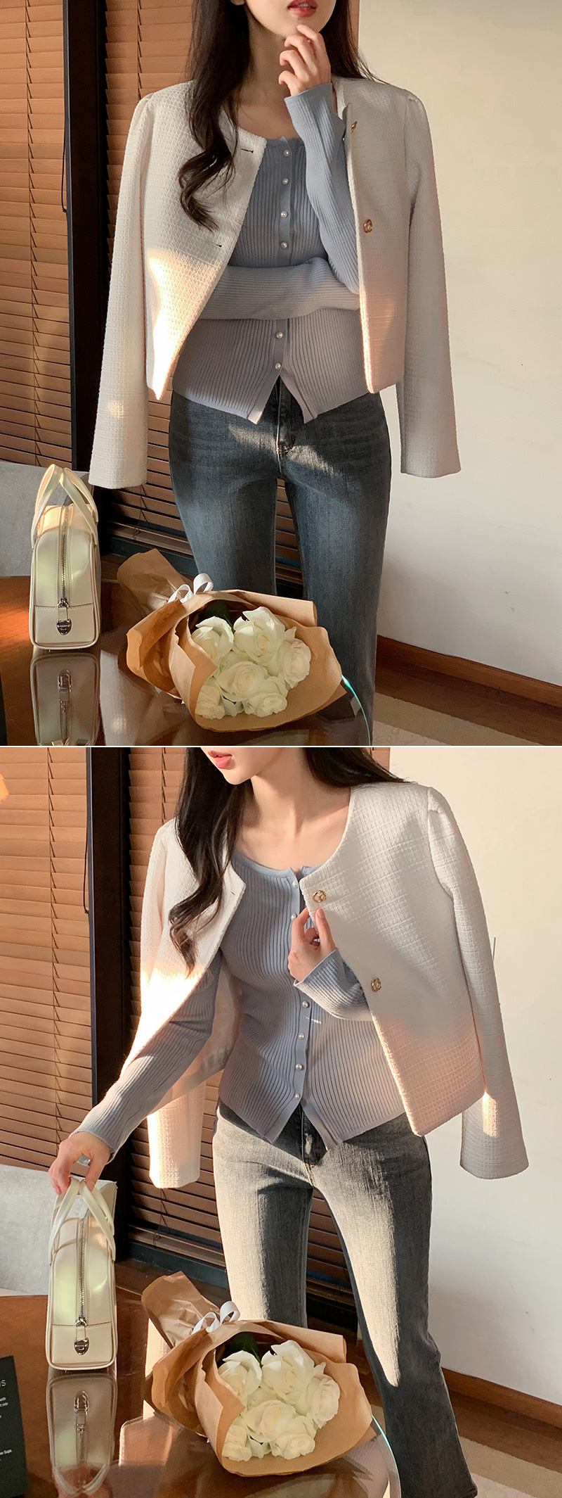attrangs-아뜨랑스 - (페미닌/청순여리) 포엘즈 진주 버튼 유넥 슬림핏 골지 가디건♡韓國女裝上衣