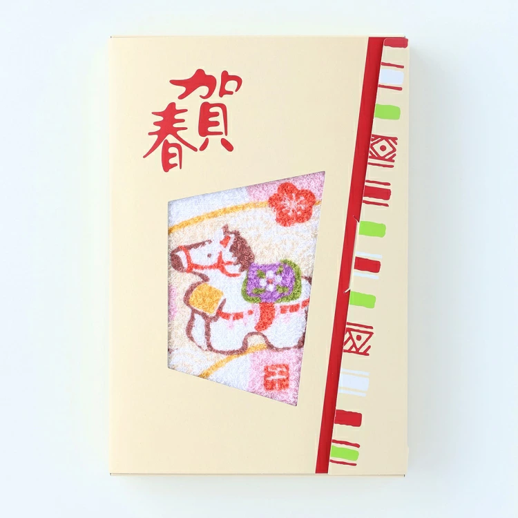 2026年的生肖是馬。這是一款以馬為主題的新年慶祝毛巾,以像徵吉祥的白馬為中心,點綴著青海波和梅花圖案,推薦用於新年祝福。