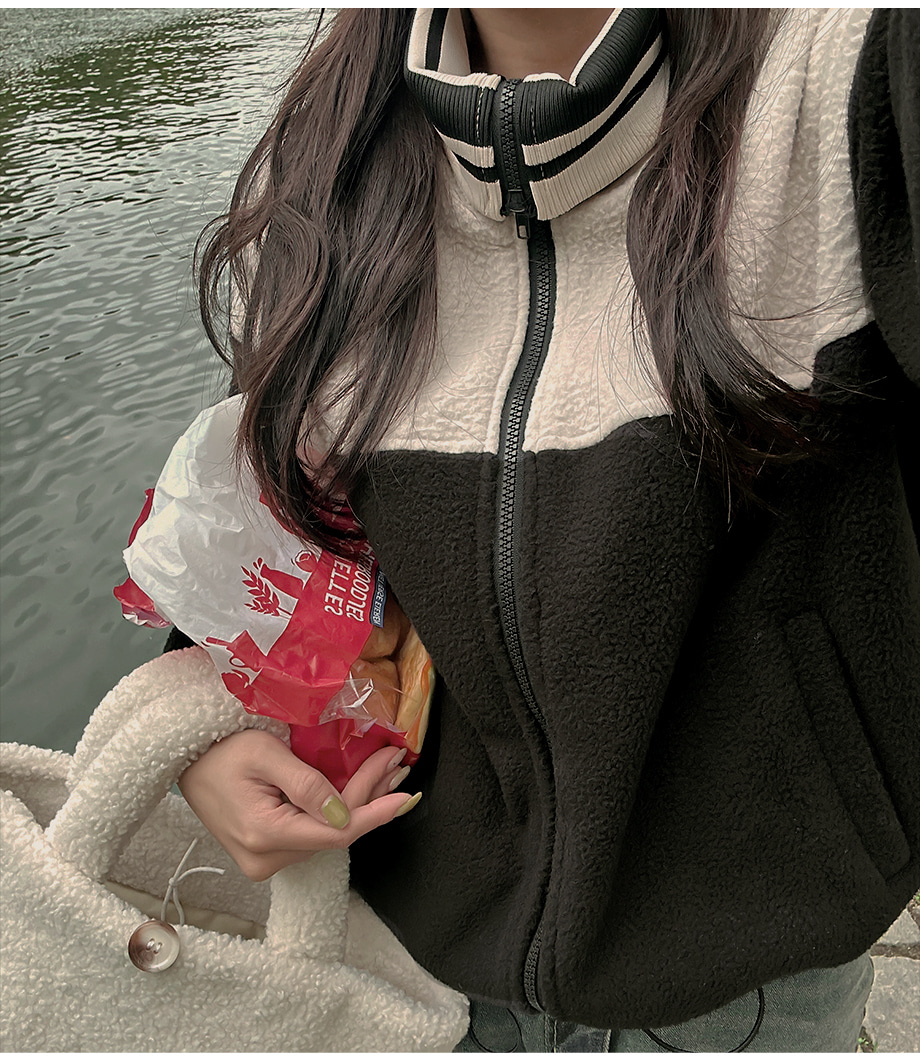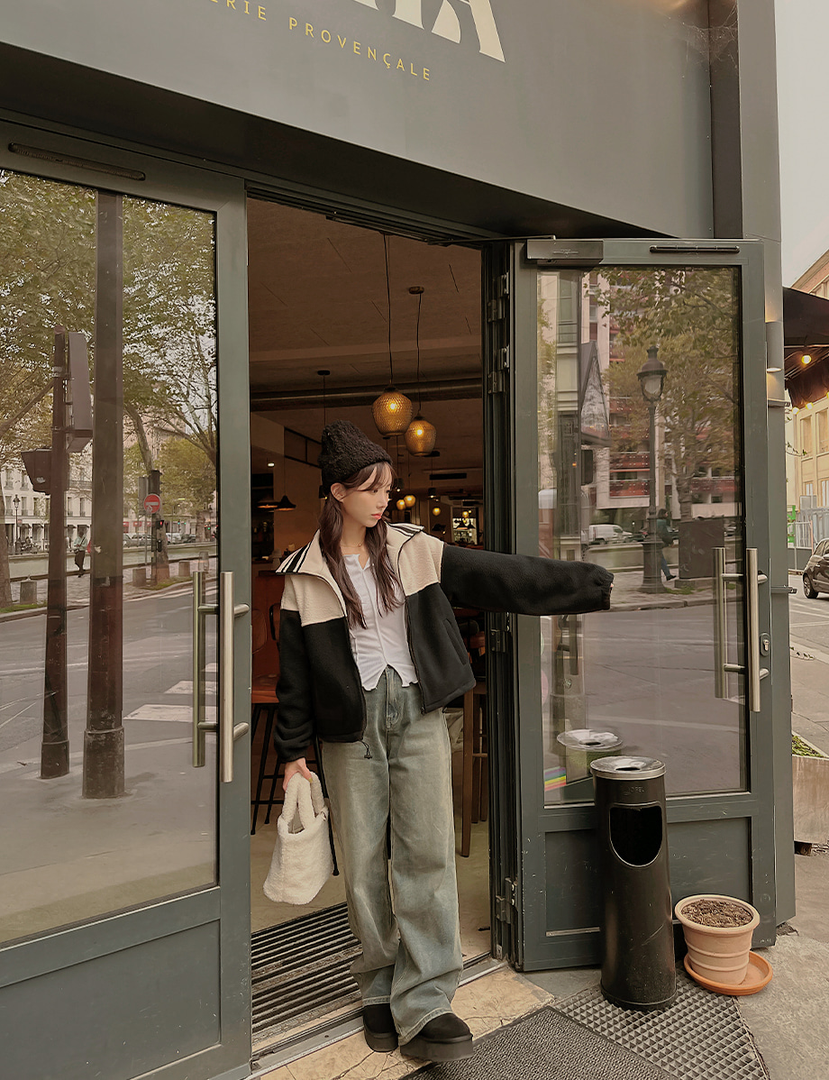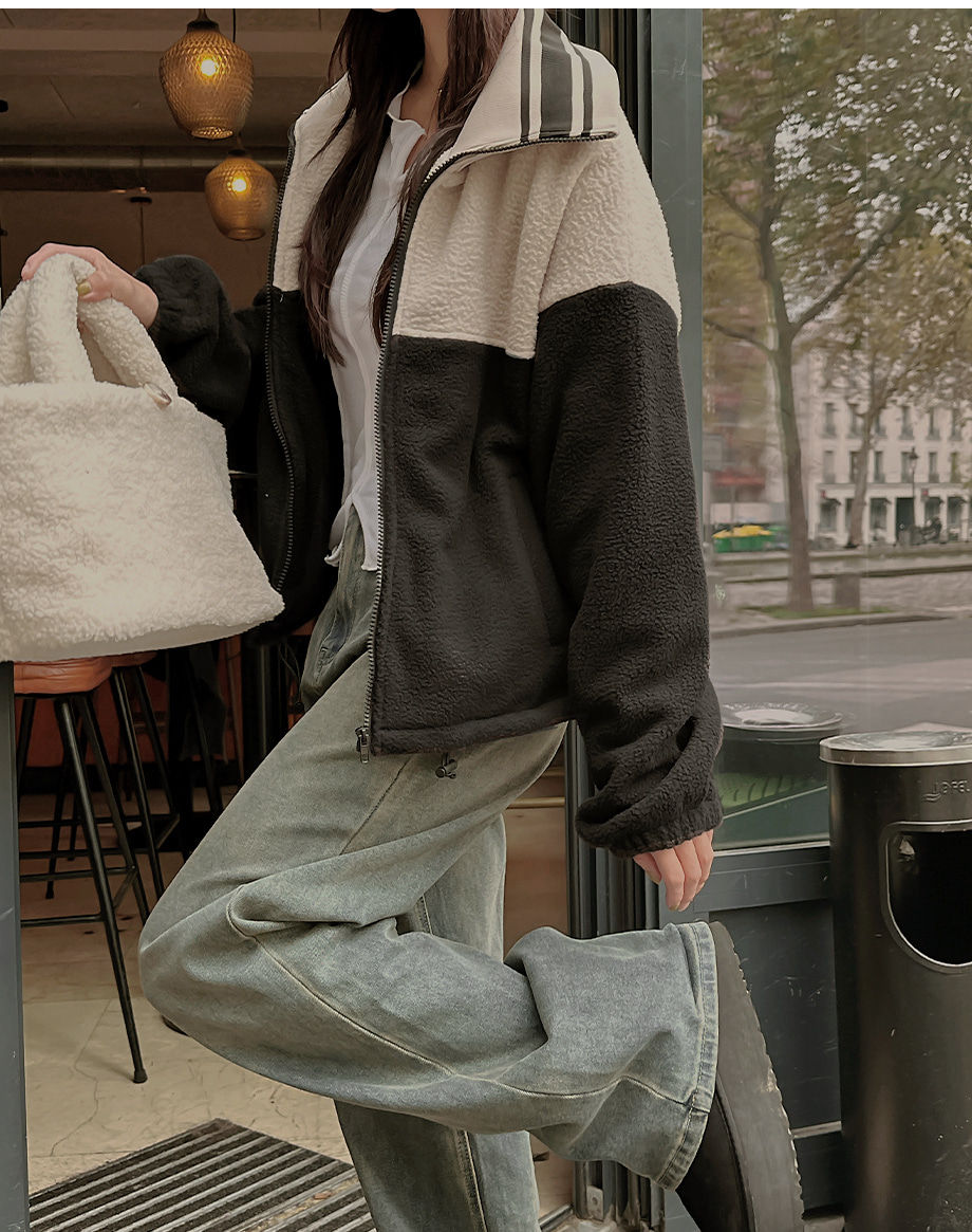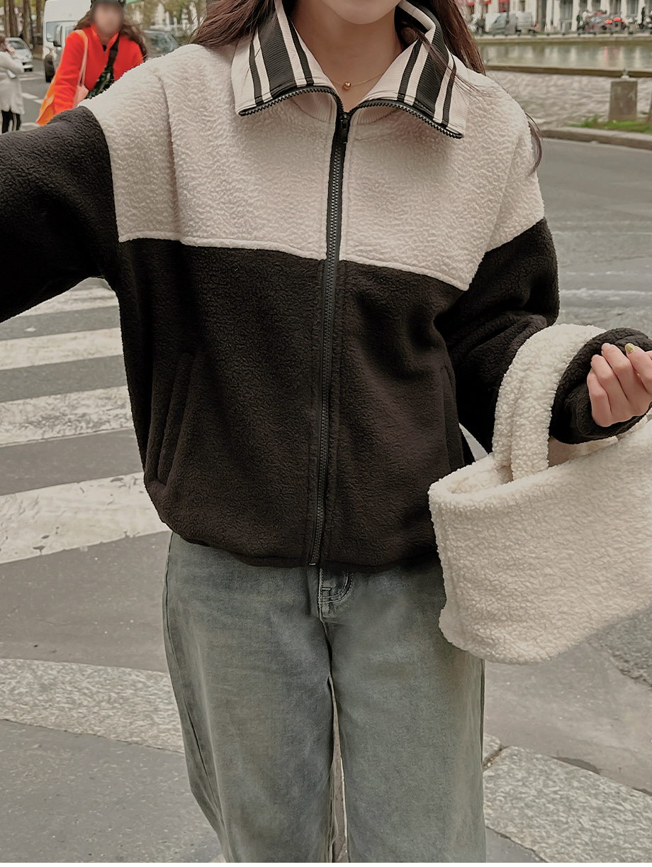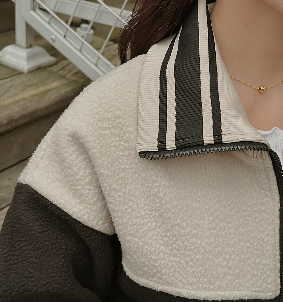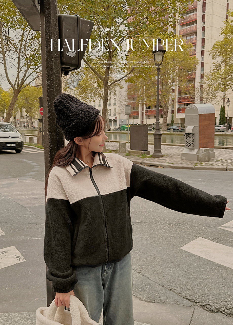 ririnco-하프덴 양털 배색 스트링 집업 점퍼♡韓國女裝外套