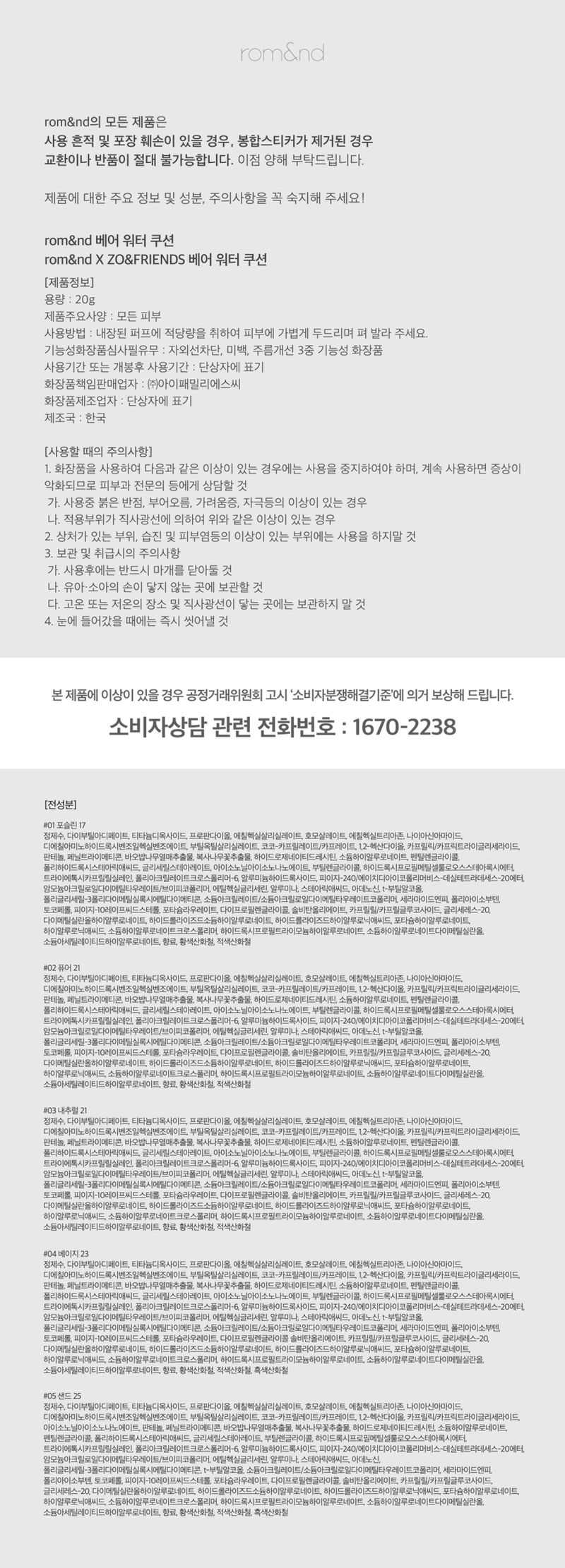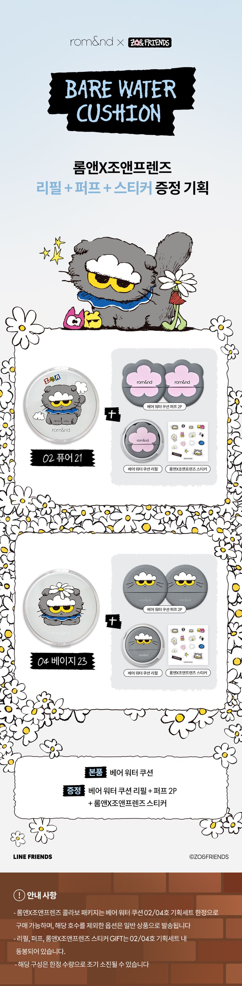 韓國 Olive Young 特別優惠套裝 - Rom&nd X ZO&FRIENDS「裸光水潤氣墊企劃組(附補充蕊+粉撲2枚)」|GD愛貓聯名彩妝這是韓國彩妝品牌 Rom&nd 與 G-Dragon 創立的角色品牌 ZO&FRIENDS 聯名推出的限量底妝產品,於 2025 年 11 月在 Olive Young 獨家登場。 產品介紹|裸光水潤氣墊企劃組(Bare Water Cushion Set) - *產品特色*: - 水潤裸光妝效:打造如水光肌般的自然光澤,輕薄貼膚,適合乾性與混合肌膚。 - 高保濕力:內含保濕精華成分,上妝同時護膚,全天維持水嫩妝感。 - 遮瑕力適中:修飾毛孔與膚色不均,呈現自然透亮膚質。 - 持妝不暗沉:長時間維持清透妝效,不易脫妝或泛油光。 - *企劃組內容*: - 裸光水潤氣墊正品 1 入 - 補充蕊(Refill)1 入 - 專用粉撲 2 枚(共3枚) - *聯名亮點*: - 包裝設計融入 ZO&FRIENDS 的角色元素,如 ZOA、小花、小肉球等,展現角色魅力與收藏價值。 - 傳遞「自由、幻想、悸動」的品牌訊息,鼓勵消費者展現自我風格。 聲明:本公司並沒持有任何品牌之版權。所有商標及版權均屬該品牌持有人,圖片及資料轉載只作分享用途,敬請留意。 |