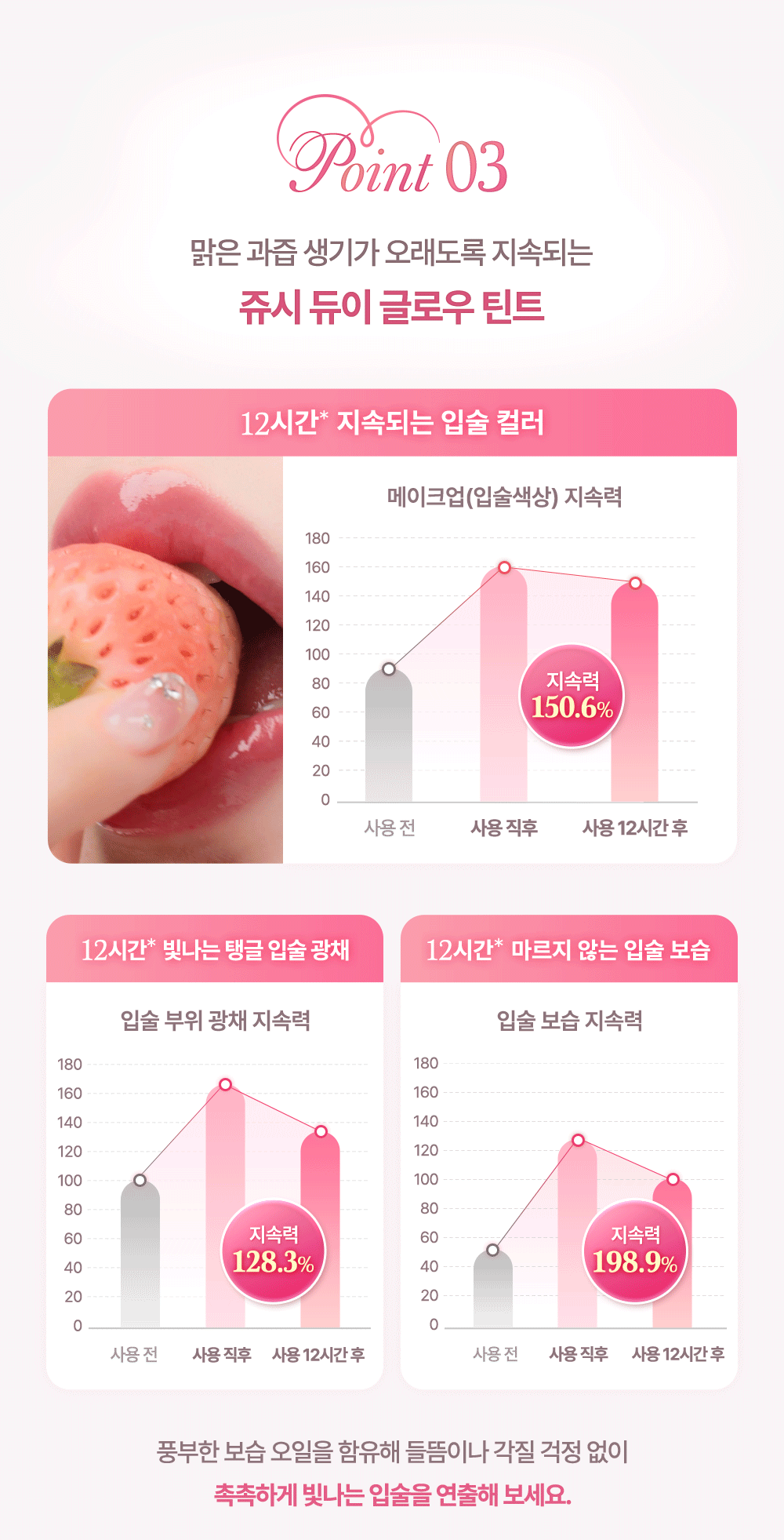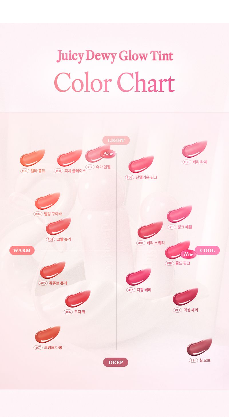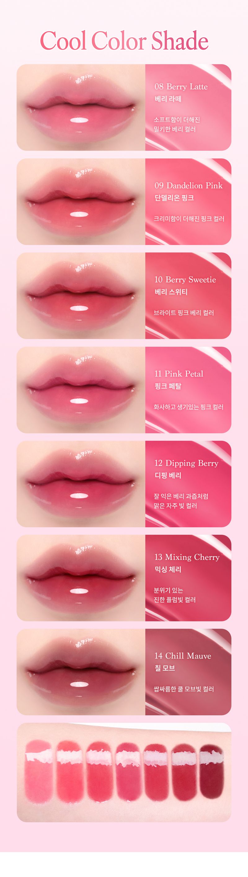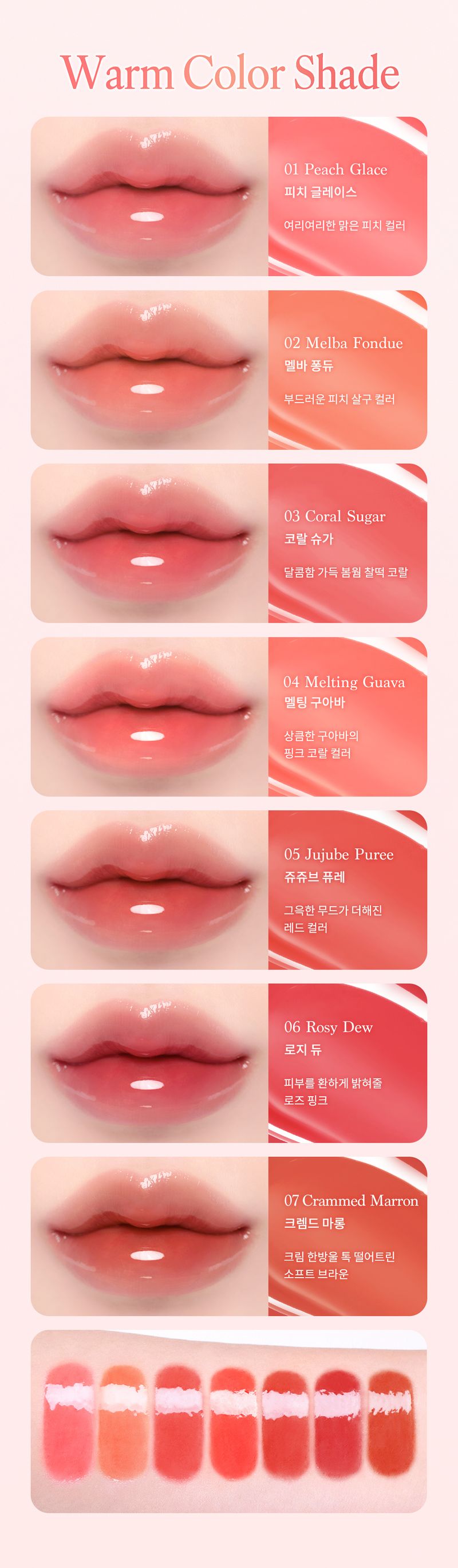 - **果汁光澤感**:添加透明光澤因子,打造水潤飽滿的「果汁唇」效果,不黏膩、不厚重。