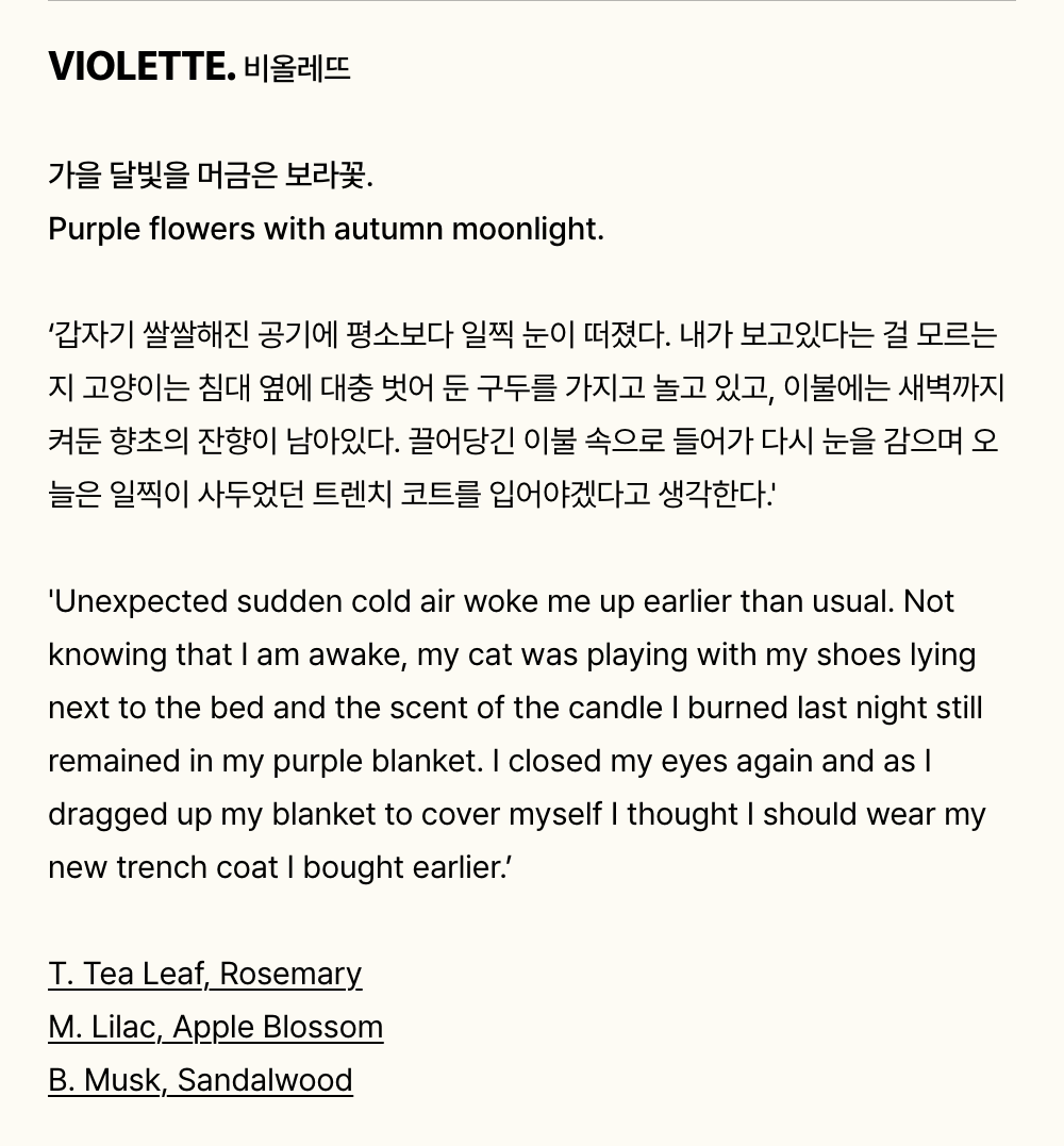 這樣的層次設計讓香氣先以草本清新展開,再透過花香柔美過渡,最後以木質沉穩收尾,呈現出「清新 → 優雅 → 沉穩」的完整氛圍。