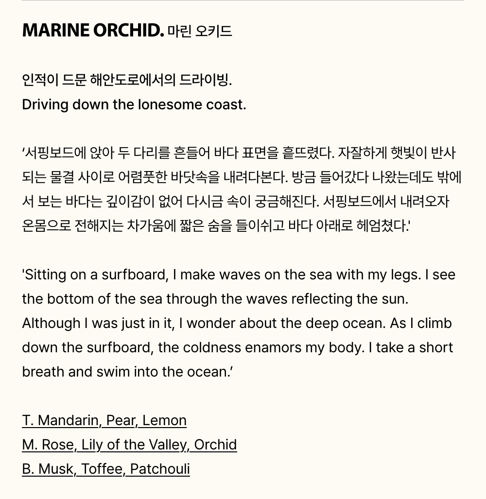 韓國 GRANHAND Marine Orchid Multi Perfume (100ml) 前調 海洋氣息、柑橘 中調 蘭花、白花調 基調 麝香、木質 香氛印象 清新海洋+花香優雅+純淨沉穩 |