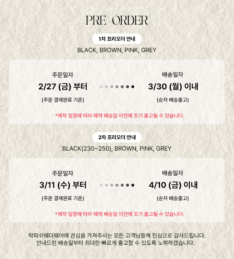 3. 因為有一些品牌在韓國出貨會比較慢,我們會在預計的日子中段時間向這公司查問貨品出貨進度, 有些品牌公司也會在這期間向我們說因為找不到物料的問題所以停售, 所以我們第一時間知道韓國出貨的時間定會馬上向加盟商會報, 希望盡量少造成缺貨!
